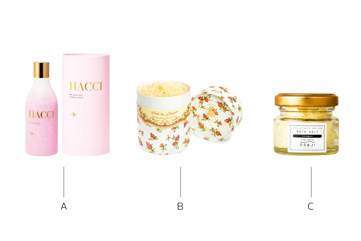 A. 国産海塩にハチミツパウダーと美容成分をコーティング。プルンと弾むような肌へ導く。BEE バスソルト フローラルハニー 300g ¥4,400(ッチ) B. ザクロの香りが全身を包みこみ、肌も柔らか&なめらかに。リッチな時間を堪能して。バスソルト ザクロ 500g ¥7,700(サンタ・マリア ・ノヴェッラ・ジャパン) C. ミネラル成分を豊富に含むヒマラヤ岩塩を配合。ボディを保湿しうるおいに満ちた肌へ。オサジ バスソルト レモングラス 30g ¥880(オサジ)