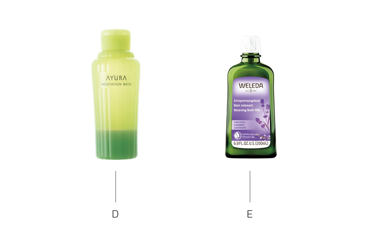 D. ローズマリーやカモミールなどをブレンドした心安らぐ香り。アユーラ メディテーションバス t 300mL ¥2,200(アユーラ) E. オーガニックラベンダーの香りが全身を包みこむ。ほっと一息つきたいときに◎。ラベンダー バスミルク 200mL ¥3,630(ヴェレダ・ジャパン)