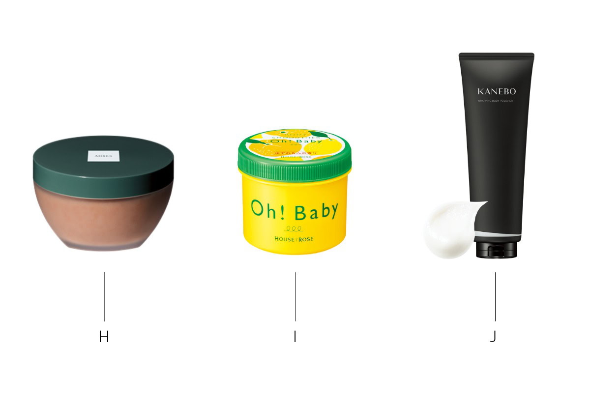 H. 柔らかなバーム処方で古い角質をマイルドにオフ。ボディスクラブ ブラッシャー モイスト 230g ¥5,940(アーレス) I. 期間限定の“ゆずれもんの香り”。ボディ スムーザー YL 350g ¥1,760(ハウス オブ ローゼお客様相談室※限定品) J. 3種のスクラブとオイルを包みこんだクリームが、心地よく肌を磨き上げる。カネボウ ラッピング ボディ ポリッシャー 220g ¥4,950(カネボウインターナショナルDiv.)