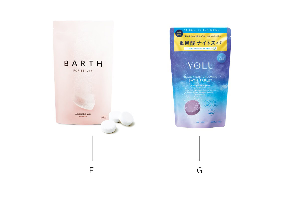 F. 重炭酸イオン(基材:炭酸水素Na、炭酸Na)に加え、コラーゲン、ヒアルロン酸(保湿剤)配合。BARTH中性重炭酸入浴料BEAUTY 30錠(10回分) ¥3,190(BARTH) G. カラダを温め、肌にうるおいもチャージ。ヨル リラックスナイトドリーミング バスタブレット 6錠入 ¥1,760(I-ne)