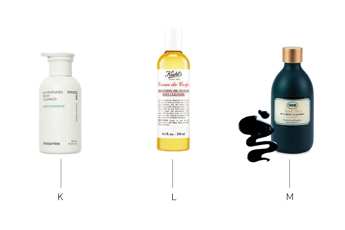 K. 洗練された香りでバスタイムを優雅に。マイパフュームドボディ クレンザー ウォーターリリー 330mL ¥2,002(イニスフリー) L. 天然由来成分を80%以上配合。キールズ クレム ドゥ コール オイル ボディ クレンザー 250mL ¥3,740(KIEHL’S SINCE 1851/キールズ) M. 余分な皮脂や毛穴汚れを吸着。ブラック ボディクレンザー デッドシー 290mL ¥4,180(サボン ジャパン)