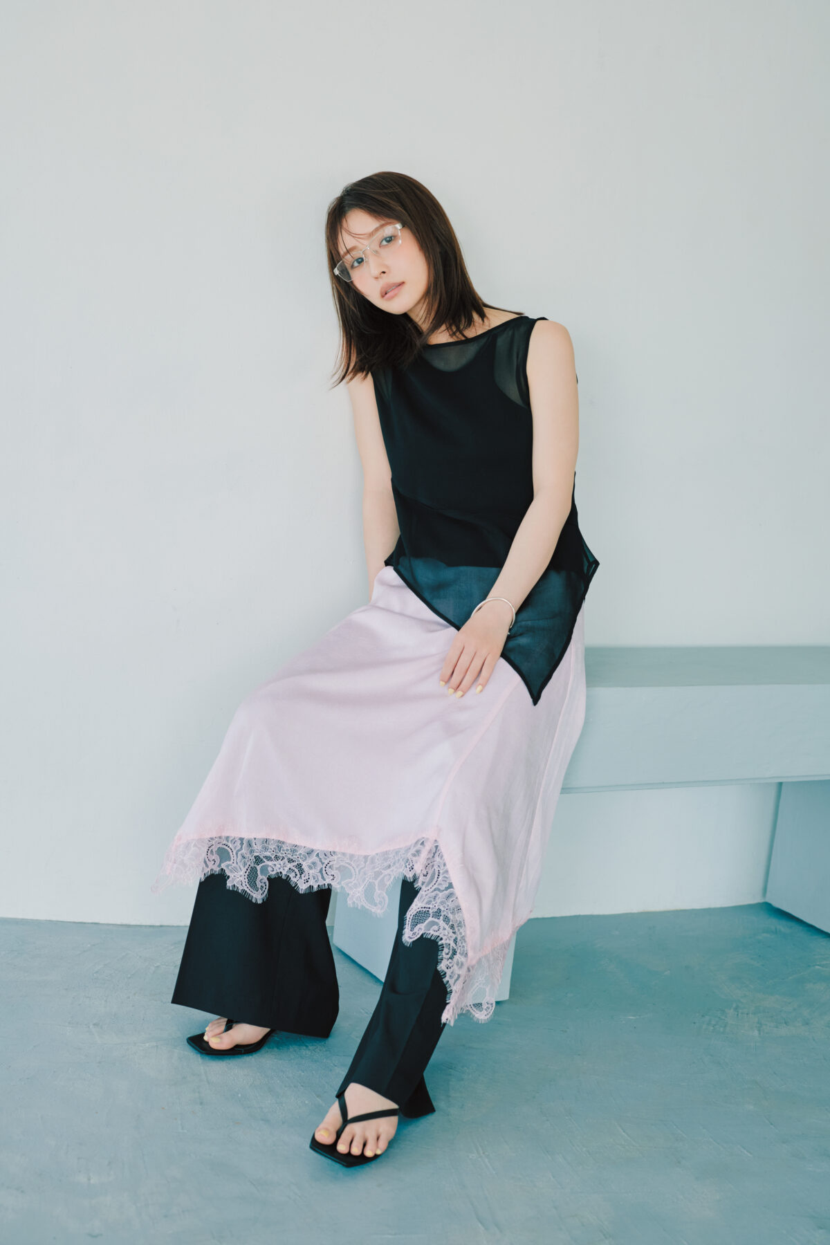 スカート¥33,000 (バウム・ウンド・ヘルガーテン/S&T)シアータンクトップ¥22,000(ラインヴァンド/ラインヴァンド カスタマーサポート)中に着たタンクトップ¥7,920 (メゾンスペシャル/メゾンスペシャル 青山店)パンツ¥8,030 (オビスアンド) メガネ¥9,420 (ミロウーマン/ハナ ショールーム)バングル¥79,200 (リューク)サンダル¥24,200 (モリーニ/ジャック・オブ・オール・トレーズ プレスルーム)
