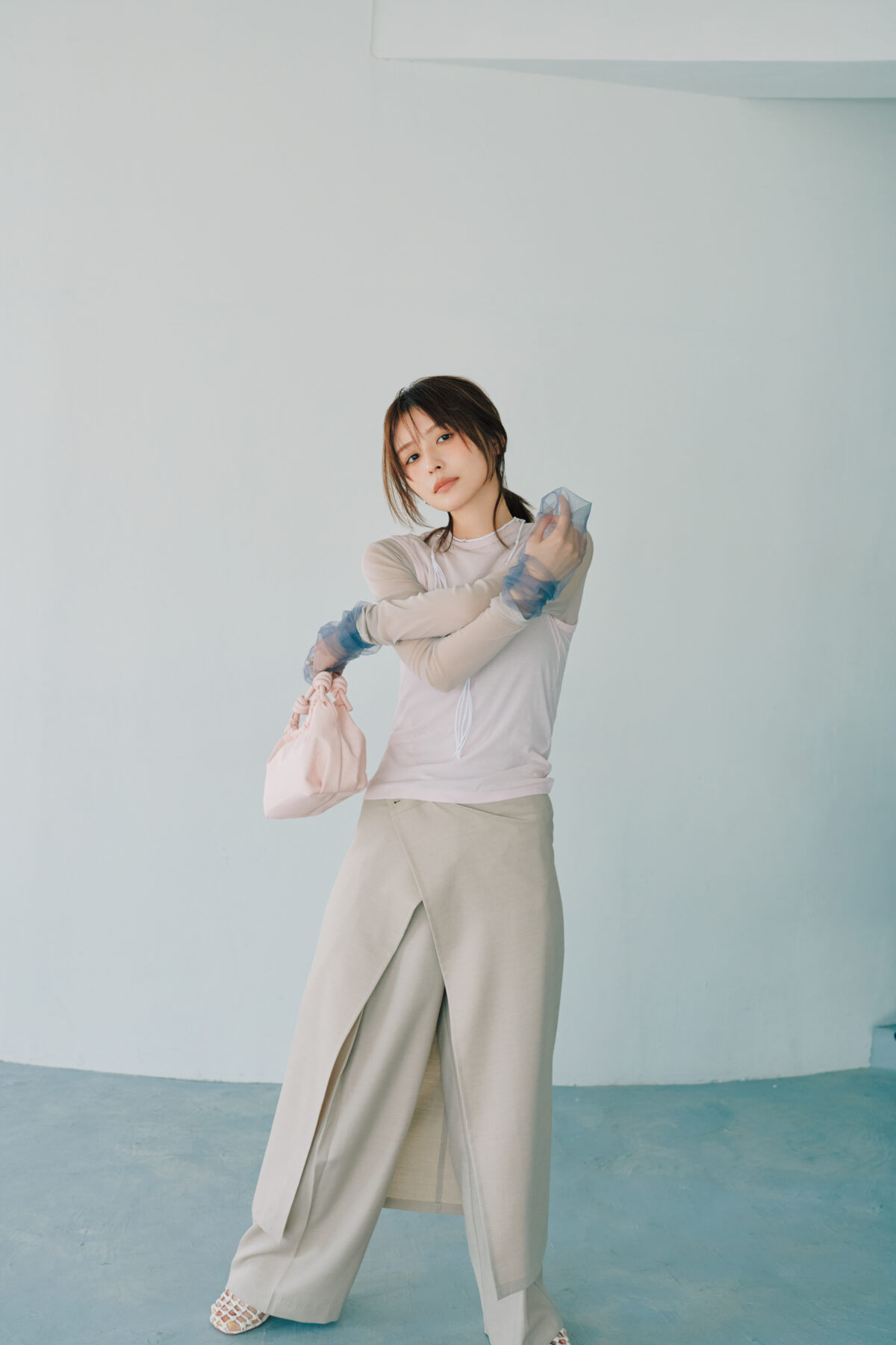トップス¥16,500 (ババコ/オーチャードレーン)中に着たシアーボディスーツ¥24,200 (マージ)、バッグ¥19,800 (ヴィスク/ともにS&T)スカート¥28,600、パンツ¥36,300( ともにリトルスージー/リトルスージー アパートメントトーキョー)チョーカー¥10,890 (ラム・シェ)ピアス¥55,000、リング¥33,000 (ともにプラウ)サンダル¥37,400(モリーニ/ジャック・オブ・オール・トレーズ プレスルーム)