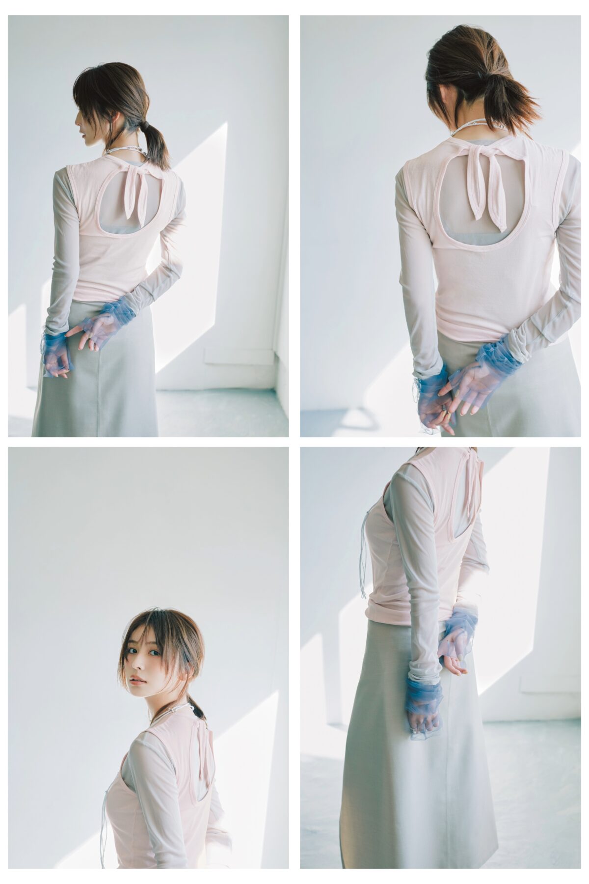 端正なベージュのボトムスを受け皿に、振り返ったときに可愛らしさのギャップがあるリボンタンクを仕込んで。淡いカラーの中でコントラストを効かせたレイヤードにセンスのよさがにじみ出る。