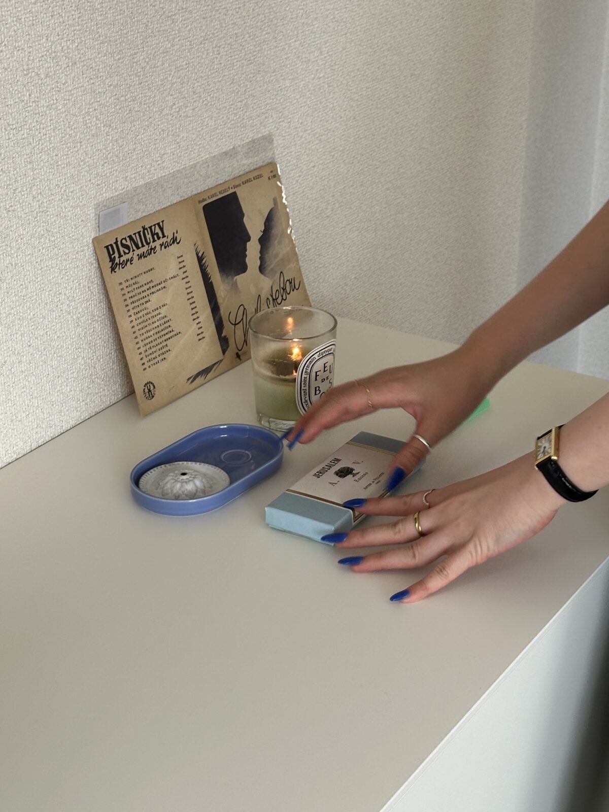 「〈アスティエ ド ヴィラット〉のお香は、旅をしたような気持ちになれるのでずっと大好き。いまはイスラエルにある世界最古の都市のひとつ『Jerusalem』の香りを愛用中です。キャンドルは〈ディプティック〉の『FEU DE BOIS』。ワックス自体にほんのりと色がついているので、スモーキーな香りはもちろん、インテリアとして映える点でも気に入っています」