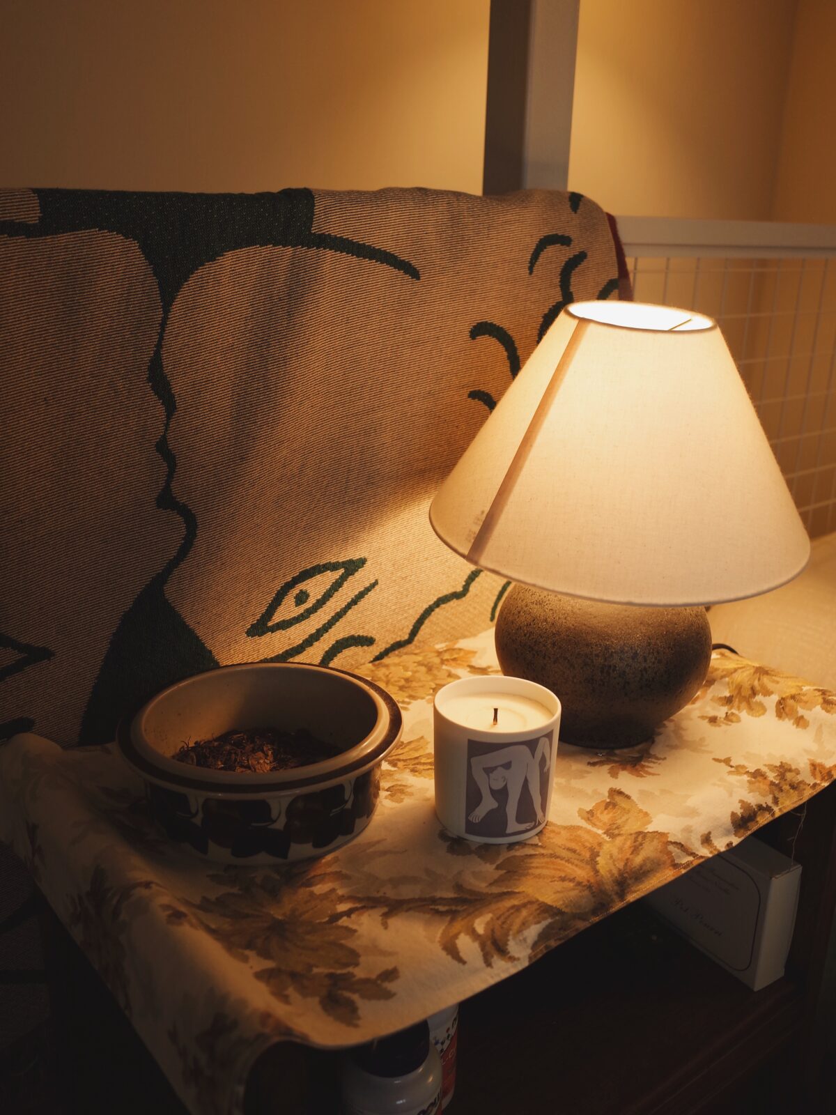 「テーブルランプはデザイナー不詳のヴィンテージのもの。腰くらいの高さに灯りがあると空間に立体感が生まれるので重宝しています。ピカソの『アクロバット』がプリントされた陶器に入った〈アーメン〉のキャンドル、〈アラビア〉のお皿に入れた〈サンタ・マリア・ノヴェッラ〉のポプリは、スパイシーな香りが心地よく、くり返し購入し、飽きずに長く愛用しています」
