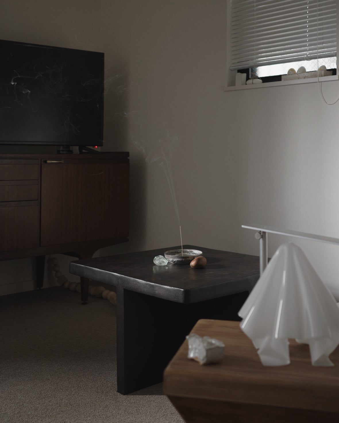 「東京都幡ヶ谷にあるBULLPEN別注で製作された稲熊家具製作所のテーブルランプは、わが家では日本の古いものや海外の民芸品とともにディスプレイ。〈東京香堂〉の白檀は、〈永瀬二郎〉さんの片口に入れ、土台は〈瀬川辰馬〉さんの箱を愛用。‟煙を立たせるまでの所作までお楽しみください”と説明書にある通り、火をつけるところから心を落ち着けて楽しめます」