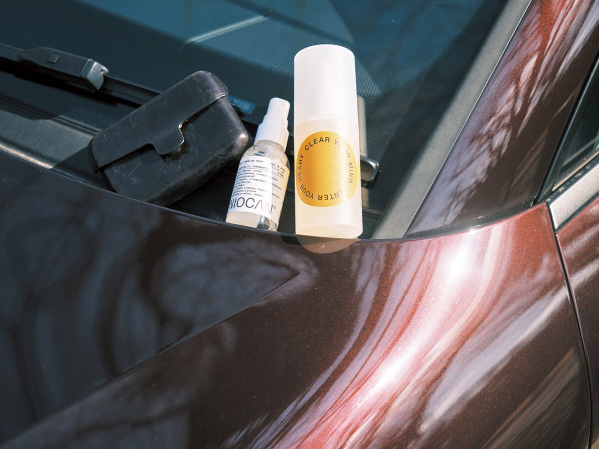 車に常備するのはこの3つ。「〈ルメール〉のカードケースには、車を運転するのに必要なカードが全部入っています。香りがよい〈セイル〉のオイルミストは顔に吹きかけられるので、花粉の季節に気になる乾燥から肌を守ってくれます。〈ニオキャン〉の消臭スプレーもひとつ載