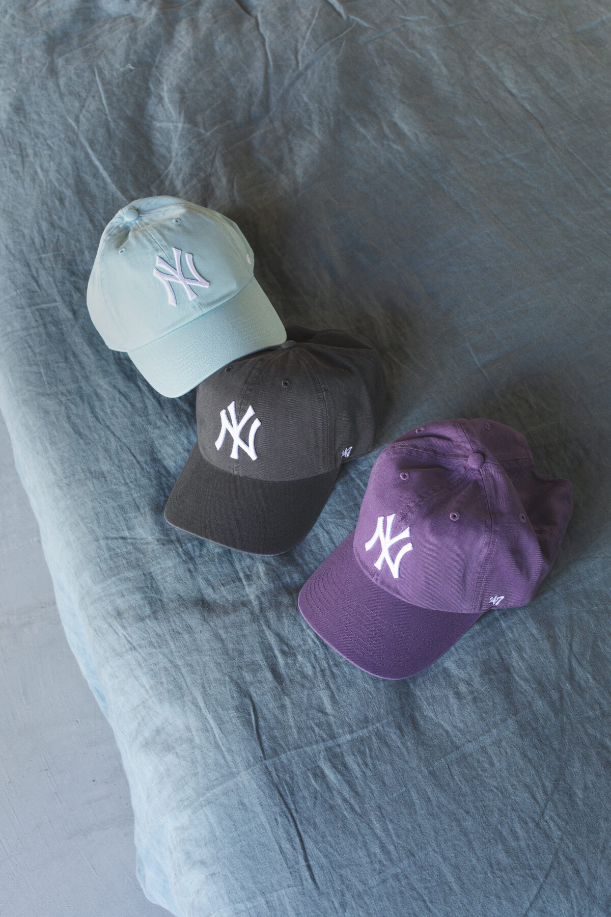 定番人気の“ニューヨーク・ヤンキース”はニュアンスカラーでさりげなく差をつけて。〈上から〉キャップ[’47 クリーンナップ ニューヨーク・ヤンキース ラグーンブルー]、キャップ[’47 クリーンナップ ニューヨーク・ヤンキース ブラック×ホワイト]、キャップ[’47 クリーンナップ ニューヨーク・ヤンキース アイリス]各¥4,400(すべてフォーティーセブン)
