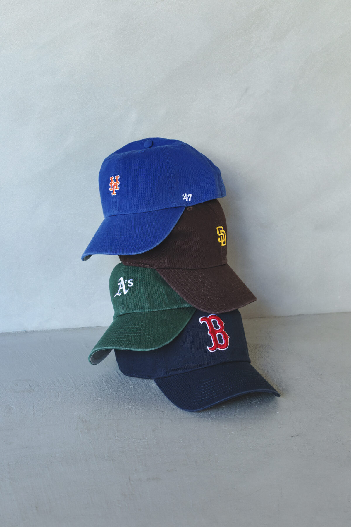 メジャーリーグに所属する全チームのキャップがラインナップ。今日はどの街を被って出かける? 〈上から〉キャップ[’47 クリーンナップ ベースランナー ニューヨーク・メッツ ロイヤル]、キャップ[’47 クリーンナップ ベースランナー サンディエゴ・パドレス カカオ]、キャップ[’47 クリーンナップ ベースランナー オークランド・アスレチックス ダークグリーン]、キャップ[’47クリーンナップ ボストン・レッドソックス ネイビー]各¥4,400(すべてフォーティーセブン)