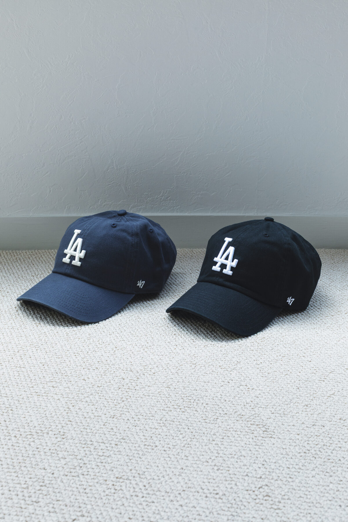 まずは、どんなコーデにもなじむ洗練カラーからトライを。〈左から〉キャップ[’47 クリーンナップ ロサンゼルス・ドジャース ネイビー×ホワイト]、キャップ[’47 クリーンナップ ロサンゼルス・ドジャース ブラック×ホワイト]各¥4,400(ともにフォーティーセブン)