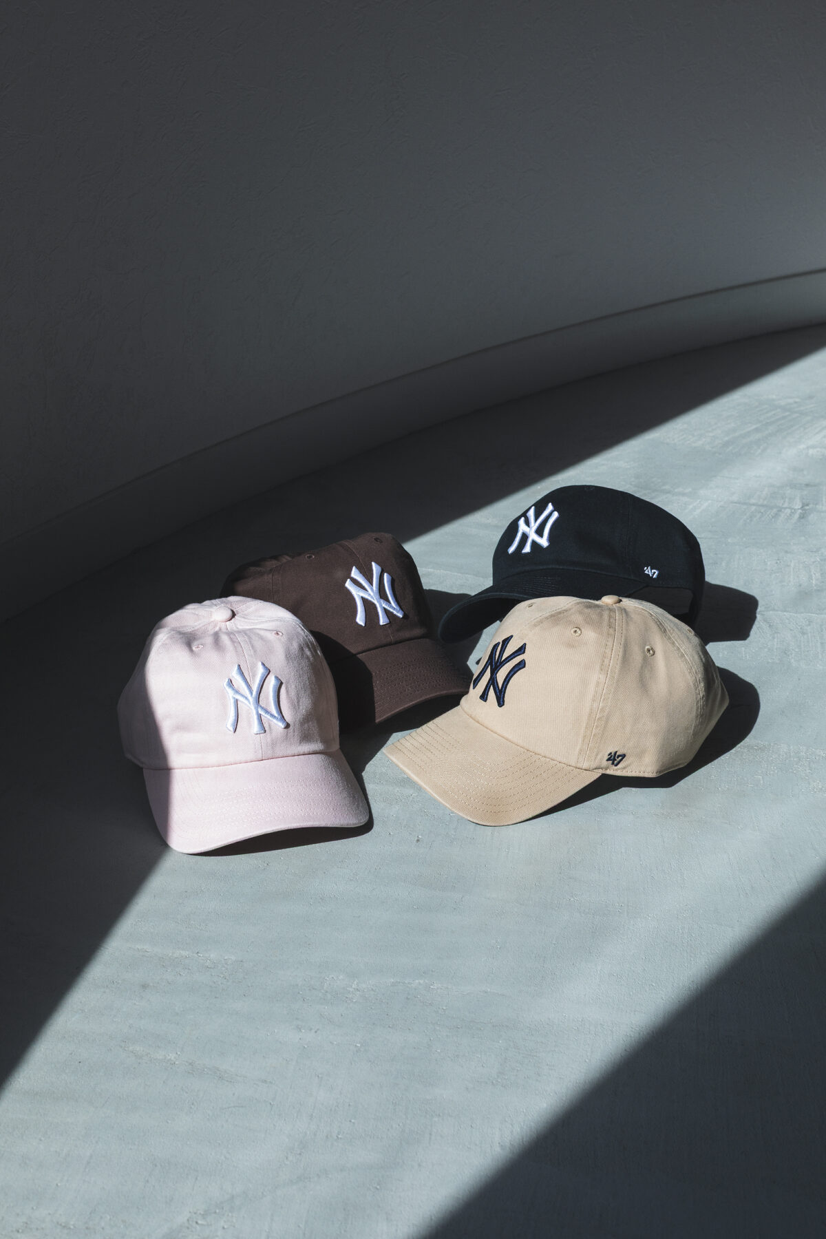 引き締めカラーからニュアンスカラーまで、カラーバリエーションが豊富なのも愛される理由。〈左から時計まわり〉キャップ[’47 クリーンナップ ニューヨーク・ヤンキース ピンク]、キャップ[’47 クリーンナップ ニューヨーク・ヤンキース ブラウン]、キャップ[’47 クリーンナップ ニューヨーク・ヤンキース ブラック×ホワイト]、キャップ[’47 クリーンナップニューヨーク・ヤンキース カーキ×ネイビー]各¥4,400(すべてフォーティーセブン)