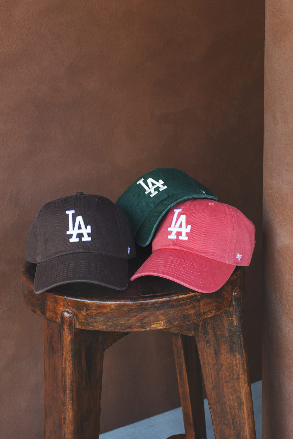 秋冬らしいこっくりとした色みをキャップで忍ばせて。〈左から〉キャップ[’47 クリーンナップ ロサンゼルス・ドジャース ブラウン]、キャップ[’47 クリーンナップ ロサンゼルス・ドジャース ダークグリーン]、キャップ[’47クリーンナップ ロサンゼルス・ドジャース アイランドレッド]各¥4,400(すべてフォーティーセブン)