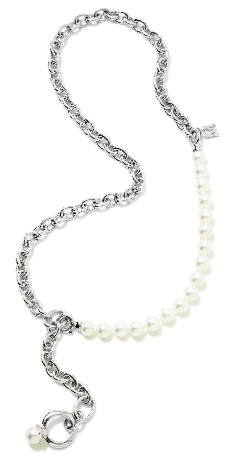 アイコニックなパールリングをモチーフにしたネックレス。シルバーチェーンとのミックスでモダンさや端正さが加わった1本は、普段づかいしやすく、装いにあわせ、長さやパールの見せ方をアレンジするのも楽しい。