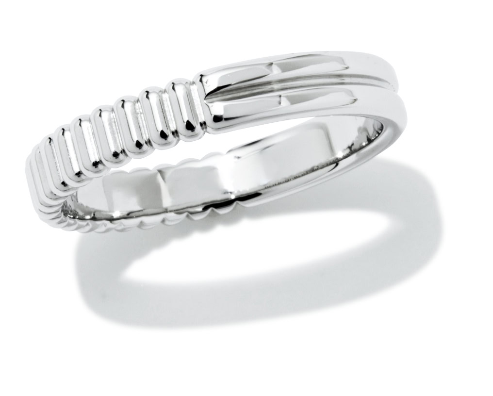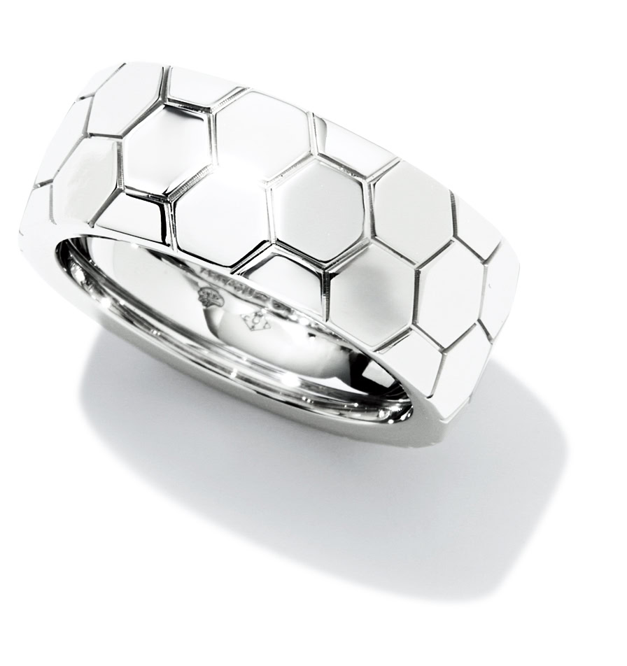 〈ショーメ〉にゆかりの深いモチーフ。新作リングは蜂の巣に由来するハニカムを、すっきりと洗練させた表情に。8㎜の幅広サイズがリュクスな存在感。