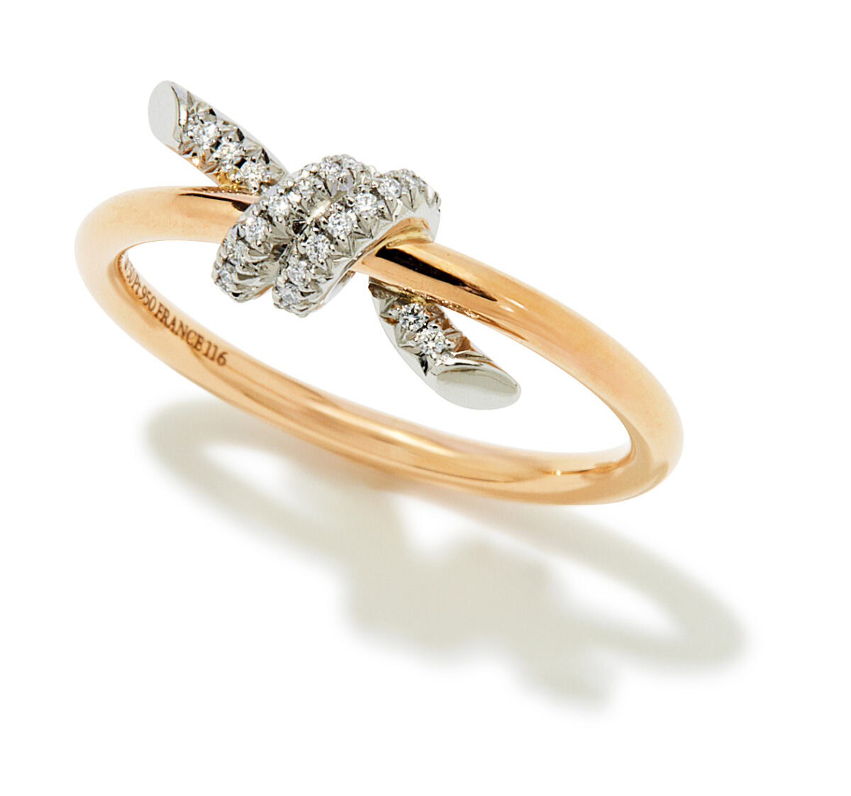 しなやかにリングに絡む結び目モチーフが、ダイヤモンドで華やかにドレスアップ。目に留まるたびに気分があがりそう。