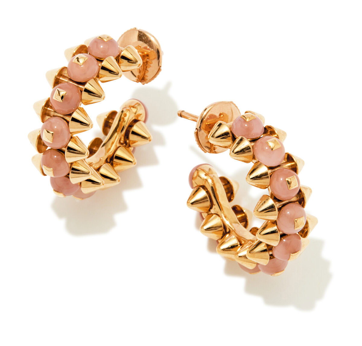 「クラッシュ ドゥ カルティエ」コレクションの新作イヤリングは、肌なじみのいいピンクゴールドにピンクカルセドニーをミックス。ビーズやピコ(円錐)、クル カレ(四角錐)と